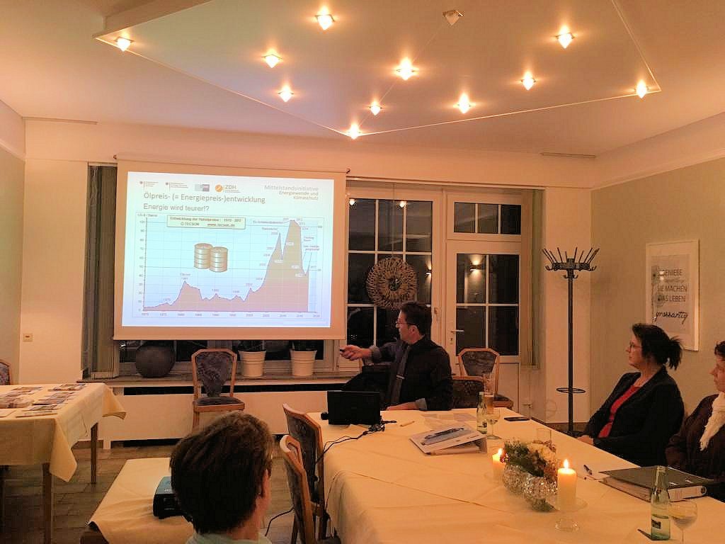 Der Referent Dr. Klaus Landrath von der Arbeitsgruppe Nachhaltigkeit der Handwerkskammer Münster stellte zuerst die Mittelstandsinitiative Energiewende und Klimaschutz (MIE) vor, sowie den Leitfaden Energieeffizienz im Handwerk.