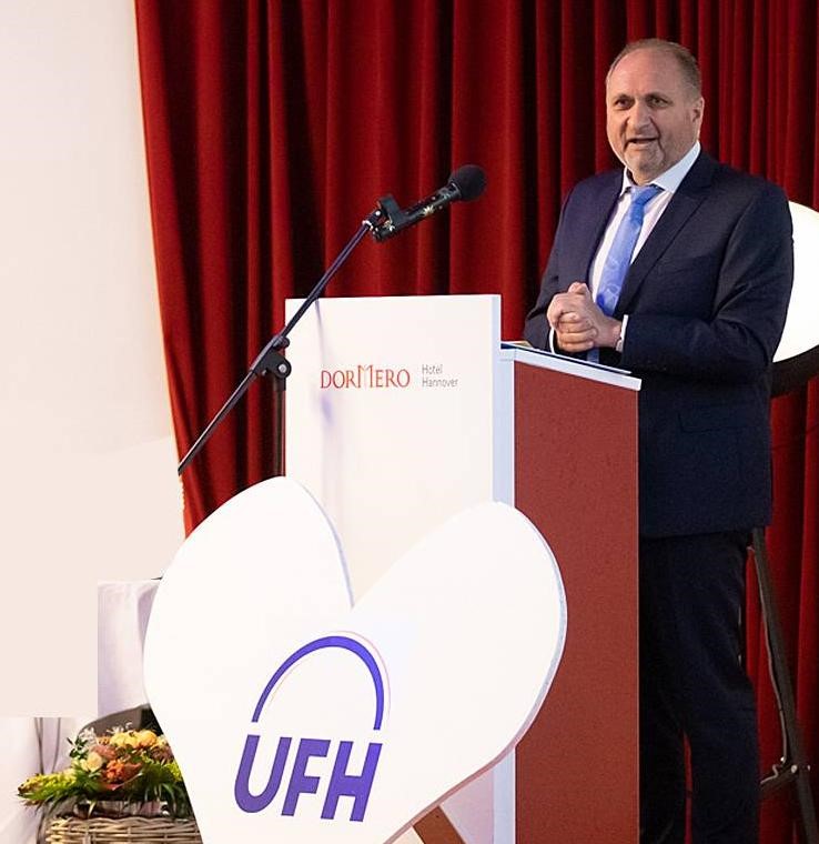 Als Vertretung des verhinderten Ministers Karl-Josef Laumann war der Staatssekretär des Ministeriums für Arbeit, Gesundheit und Soziales des Landes NRW Matthias Heidmeier auf dem Podium, der bis 2022 auch Hauptgeschäftsführer des Westdeutschen Handwerkskammertages (WHKT) war. Der Politiker gab jede Menge Aussichten auf anstehende und sich aktuell in der Umsetzung befindende Ziele. So sprach sich Heidmeier für die Gleichwertigkeit von akademischer und beruflicher Bildung aus. Er lobte die Meisterprämie und versprach den Vorsatz, diese beizubehalten. Des Weiteren würdigte er die Bundesinitiative zum Thema Mutterschutz für Selbstständige, die wiederum von der Bundesvorsitzenden der UFH Tatjana Lanvermann stark nach vorne getragen wird.